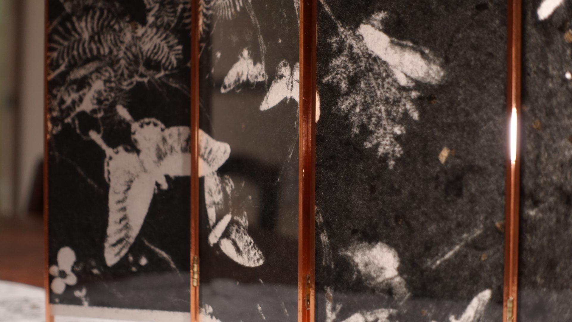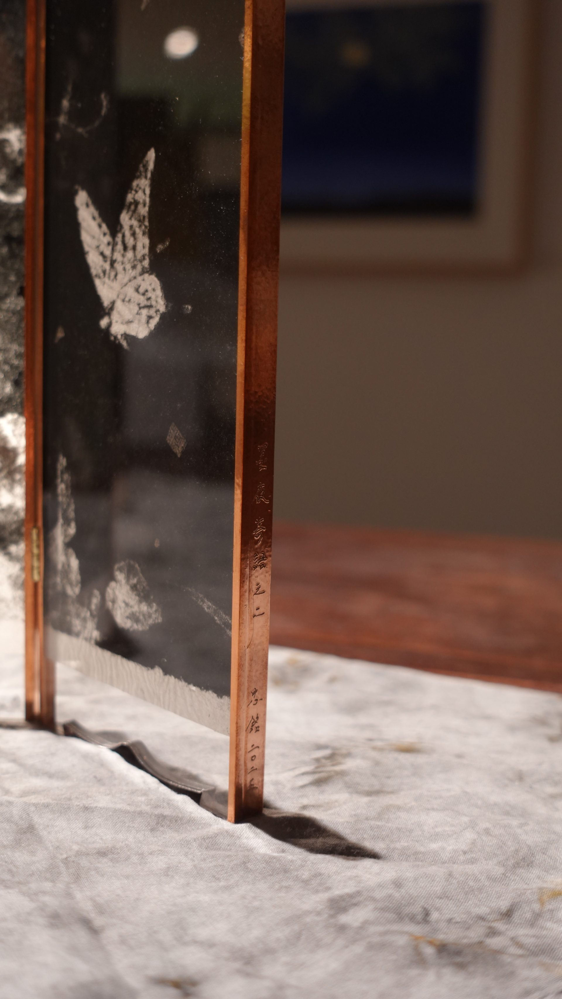 The imagery on the screen derives from the Qing dynasty painting Hundred Butterflies (now in the collection of the National Palace Museum, Taiwan). Through the artist’s reinterpretation and reconstruction, the work transforms the historical motif into fluttering butterfly shadows that dance within the depths of an ink-dark night.