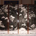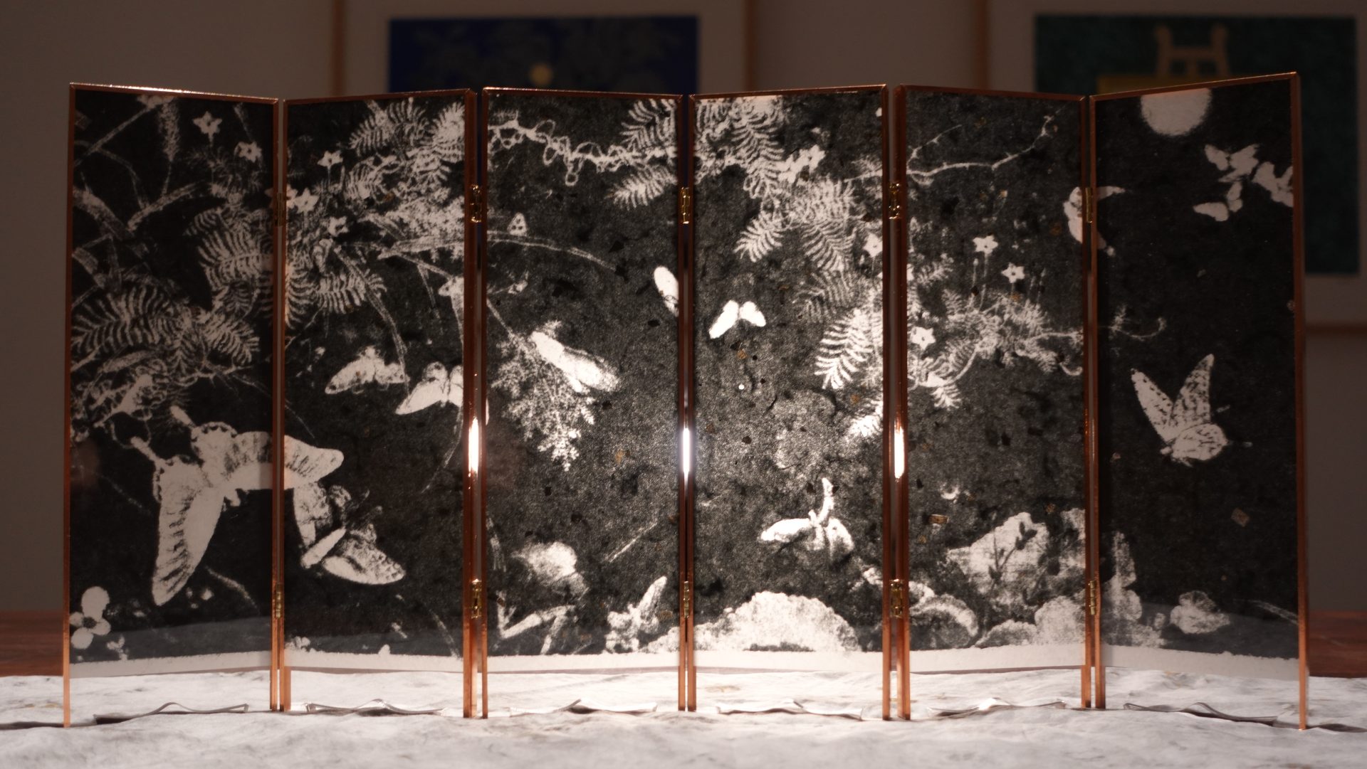 The translucent black paper fibers represent a new breakthrough in watermark papermaking. Beyond using fiber density to form imagery, the artist has achieved delicate gradations within the dyed black pulp itself. Crafted from watermark handmade paper, acrylic, and red copper foil, the folding screen transforms the elegance of the past into a contemporary expression — a tranquil nocturnal whisper that can be appreciated from both sides.